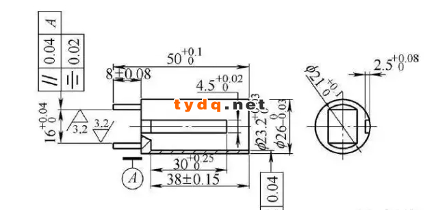 图1 所示零件的材料为40Cr,要求热处理硬度达到28~32HRC,零件右端孔的内径为23.2+0.030 mm、外径为26 0-0.03mm,孔深(38±0.15)mm,圆柱方向上有宽4.5+0.020 mm、深2.3+0.080 mm的键槽。