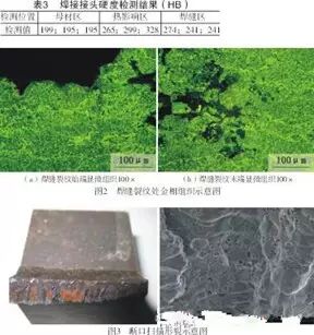 从表3可以看出,焊缝区和热影响区的硬度高于母材。而在正常情况下,该处的硬度值高于母材。