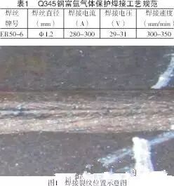 生产过程中,Q345钢焊接工艺为富氩气体保护焊接,其工艺规范见表1。